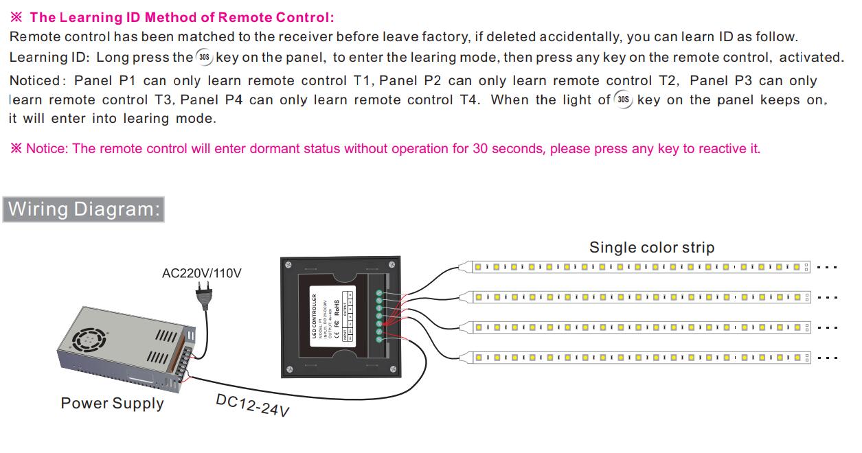 1 Piece of Bincolor Led P1+T1 12V-24V 4ch Dim Panel Wireless Remote Dimmer Controller