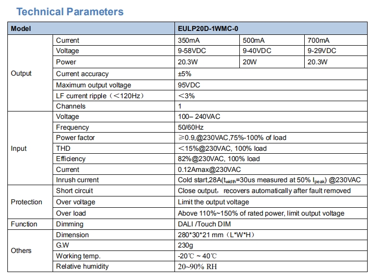 by DIP switch and complies with DALI standard protocol IEC 62386. EULP20D-1WMC-0 can be connected to DALI
